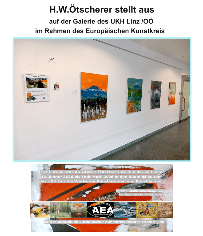 Im Rahmen der aktuellen Ausstellung des Europäischen Kunstkreises stellt der Künstler H.W.Ötscherer drei ausgewählte Werke unter dem Leitthema „ROT“ vor. Die Arbeiten reflektieren auf eindrucksvolle Weise die emotionale und landschaftliche Vielfalt, die mit dieser Farbe verbunden ist.